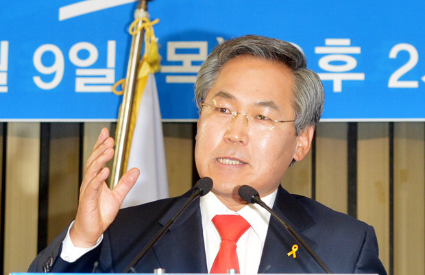 새정치민주연합 원내대표 보궐선거를 위한 의원총회가 열린 9일 오후 서울 여의도 국회 246호실에서 우윤근 원내대표가 수락연설을 하고 있다.