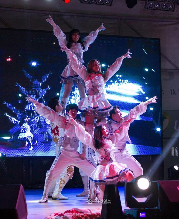 지난 11일 광주 광천동 유스퀘어 야외무대에서 열린 대학생 U응원제에서 참가 학생들이 멋진 무대를 선보이고 있다. (사진제공=2014광주하계유니버시아드대회 조직위원회)