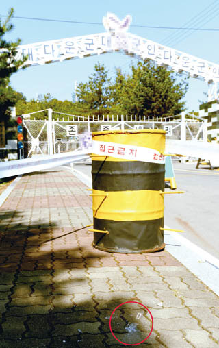 11일 오후 경기도 연천군 우리 군 위병소 앞에 전날 북한이 우리 탈북단체가 날린 대북전단을 조준해 발사한 것으로 보이는 실탄으로 깊에 패인 보도블럭 주변이 통제되고 있다. 북한은 10일 오후 우리 탈북민 단체가 경기도 파주 연천 일대에서 날린 대북전단(삐라) 풍선을 향해 14.5㎜ 고사총 10여 발을 쏴 일부 탄두가 우리측 군 위병소 앞과 면사무소 내에 떨어졌다. 우리 군은 북한군이 쏜 총탄이 우리 지역에 떨어진 것을 확인한 뒤 진돗개 하나를 발령하고 K-6 기관총 40여 발을 인접 북한군 GP(비무장지대 내 소초)를 향해 대응 사격했다.이후 남북 GP 간 2차 총격전도 벌어졌다.