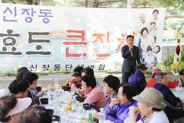 최근 경기 오산시 중앙·대원·남촌·신장 4개동에서 노인의 날을 기념해 사회 발전에 기여해온 노인들의 노고에 감사하는 사회적 분위기를 조성하고 경로효친사상을 실천하기 위한 '경로효도잔치'가 열렸다. 사진은 신장동에서 열린 잔치에 참여한 주민들과 곽상욱 시장의 모습. (사진제공=오산시청)