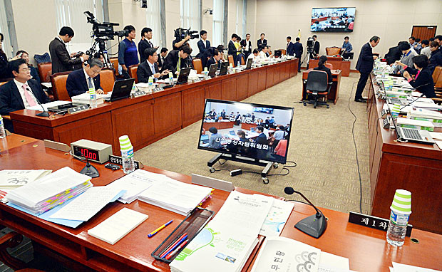 13일 오전 서울 여의도 국회 산업통상자원위원회 회의실에서 열린 산업통상자원부 등에 대한 국정감사에서 윤상직 장관의 산하기관 국감자료 사전검열 논란으로 감사중지가 선언되어 의원 및 기관장들의 빈 자리가 보이고 있다.