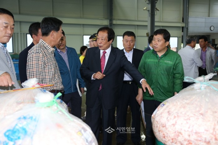 | ▲ 지난 7월 지도 송도위판장 새우육젓위판 현장을 방문한 고길호 신안군수의 모습. (사진제공=신안군청) | ||