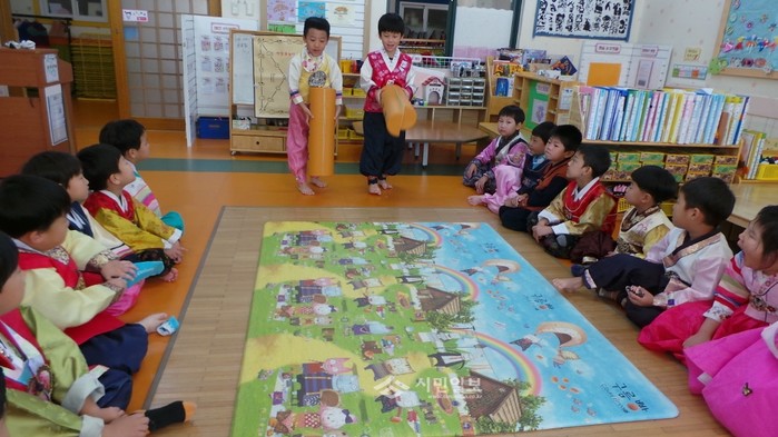 경북 구미사곡초등학교병설유치원은 최근 '우리나라' 생활주제와 연계해 우리나라 민속놀이의 중요성을 알리고 다같이 체험하는 '민속놀이 한마당'을 개최했다. 사진은 윷놀이를 즐기고 있는 아이들의 모습. (사진제공=구미교육지원청)