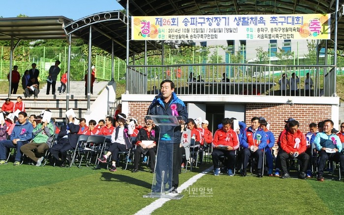 지난 12일 서울 송파구 방이동에 위치한 송파여성축구장에서 29개 동호회가 참여한 가운데 '제26회 송파구청장기 축구대회'가 열렸다. 이 자리에 참석한 임춘대 구의회의장은 “송파구의회에도 생활체육이 활성화 될 수 있도록 최선을 다하겠다"고 밝혔다. 사진은 축사 중인 임 의장의 모습. (사진제공=송파구의회)