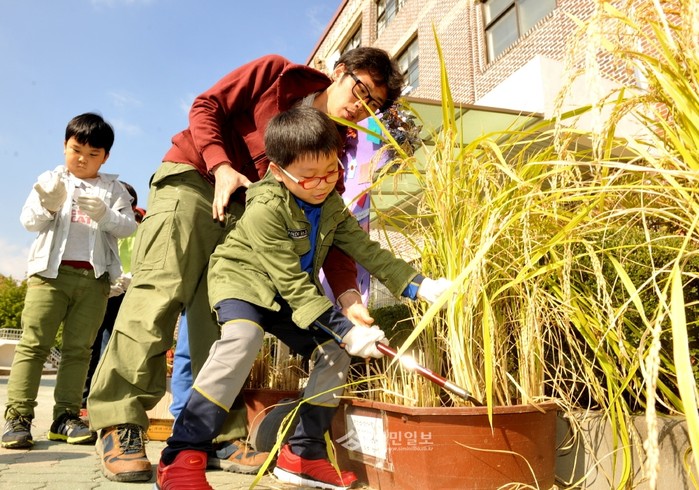 서울 노원구는 15일 상월초등학교에서 남원농협과 함께 친환경쌀 수확체험을 실시했다. 사진은 벼베기를 체험하고 있는 학생들의 모습. (사진제공=노원구청)
