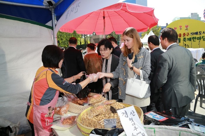 서울 중구는 지난 14일 청계광장에서 장성, 속초, 무주, 포천, 영동, 여주, 부여 총 7개 자매도시가 참여한 길놀이 행사 '제3회 서울 중구 자매도시 농특산물 축제 한마당'을 개최했다. 사진은 축제에 참여한 외국인이 특산품을 구매 중인 모습. (사진제공=중구청)