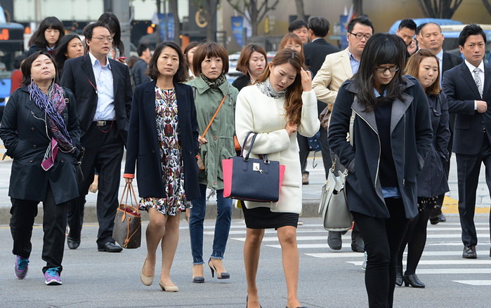 아침 기온이 어제보다 더 떨어져 올가을 들어 가장 추운 아침을 보인 15일 오전 서울 광화문 사거리에는 쌀쌀한 날씨에도 직장인들이 출근을 서두르고 있다.