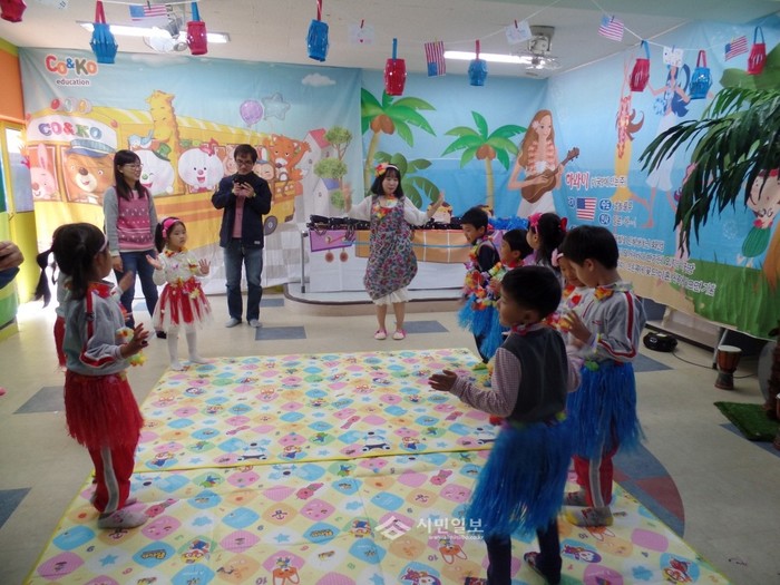 경북 구미 산동초등학교병설유치원은 지난 14일 원아들과 학부모를 대상으로 세계 여러나라 악기와 춤을 체험하는 ‘두비두비 음악캠프’를 개최했다. 사진은 하와이 전통 춤인 훌라 춤을 추고 있는 아이들의 모습. (사진제공=구미교육지원청)