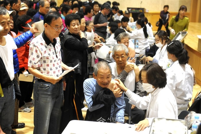 노원구는 환절기에 발생하는 독감에 대비해 만 65세 이상 노인을 대상으로 16일 구청 2층 대강당에서 무료 독감 예방접종을 실시했다. 사진은 예방접종을 맞고있는 주민들의 모습. (사진제공=노원구청)