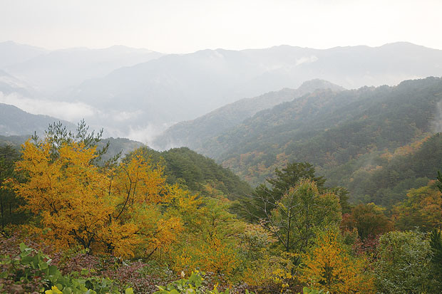 서리가 내린다는 상강(霜降)을 1주일 앞둔 16일 강원 화천 해산터널부터 평화의 댐까지 아흔아홉 굽이의 단풍이 절정을 이뤄 관광객들을 반기고 있다.