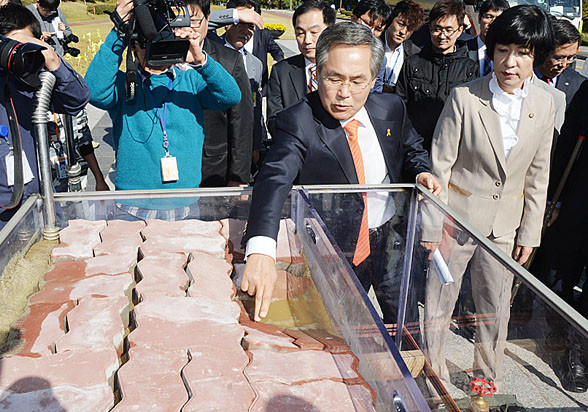 16일 오후 서울 여의도 국회 본청 계단 앞에서 환경노동위원회 새정치민주연합의원실 공동으로 주최한 노후 상·하수도관 누수 때문에 토사유출 및 상층지반 붕괴현상(싱크홀) 모형실험에서 침하된 보도블록을 우윤근 원내대표와 김영주 환노위위원장이 지켜보고 있다.