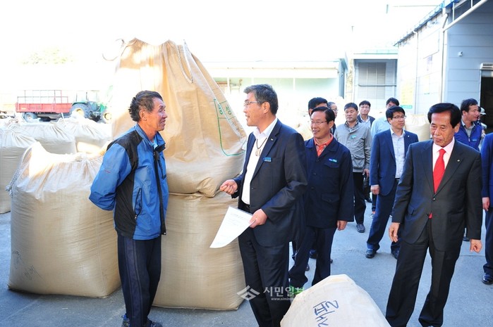 지난 15일 원경희 경기 여주시장(오른쪽)은 여주시 가남읍 심석리 농협 수매현장을 방문해 관계자와 농업인의 노고를 격려하고 농업인들의 흘린 땀이 헛되지 않게 수매일정에 차질이 없도록 만전을 기할 것을 당부했다. 사진은 이날 현장을 찾은 원 시장의 모습. (사진제공=여주시청)