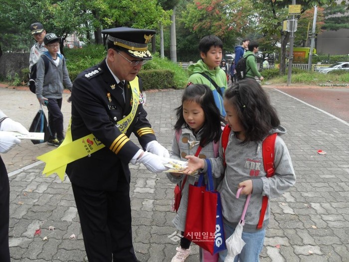지난 16일 오전 경기 구리경찰서가 구리시 토평동의 부양초등학교에서 경찰, 학교 관계자 40여명이 참여한 가운데 통학하는 어린이들과 인근 도로 이용자들을 대상으로 통학차량 안전준수, 과속금지 등을 홍보하고 횡단보도 보행지도를 포함한 교통안전 캠페인을 실시했다. 사진은 홍보물을 배포중인 경찰 관계자들의 모습.(사진제공=구리경찰서)