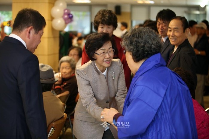 지난 16일 '제18회 경로의 달'을 맞아 신연희 강남구청장이 서울 강남구 기쁜소식교회에서 열린 ‘도곡2동 어르신 경로잔치’에서 잔치에 참석한 한 노인과 손을 맞잡으며 인사를 나누고 있다.(사진제공=강남구청)