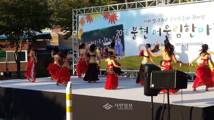 경기 동두천시 불현동 주민자치위원회는 최근 불현동 휴먼시아 앞 내행1공원에서 주민자치위원회 주관으로 주민자치센터 자체 작품발표회인 '2014 불현동 어울림마당'을 개최했다. 사진은 어울림 한마당에서 공연참가자들이 벨리댄스를 추는 모습. (사진제공=동두천시청)