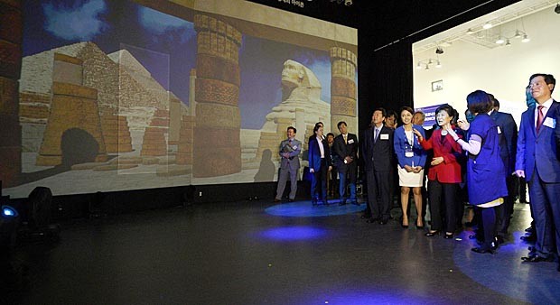 박근혜 대통령이 20일 오전 부산 해운대구 APEC로 벡스코(BEXCO)에서 열린 ‘2014 ITU 전권회의 개회식’을 마친 후 월드 IT 쇼 전시장을 찾아 KT K-live 홀로그램 공연 시연을 참관하고 있다.