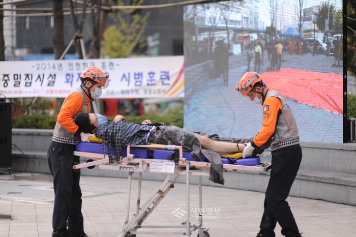 서울 중랑구가 최근 대형건물 화재, 풍수해, 지진 등 각종 재난에 대비해 중랑소방서, 중랑경찰서, 한국전력공사 동부지점 등 10개 유관기관, 민간단체와 함께 '재난 대응 안전한국훈련'을 실시했다. 사진은 최근 상봉동에 위치한 프레미어스 엠코에서 다중밀집시설 화재대응 훈련을 진행하고 있는 모습. (사진제공=중랑구청)