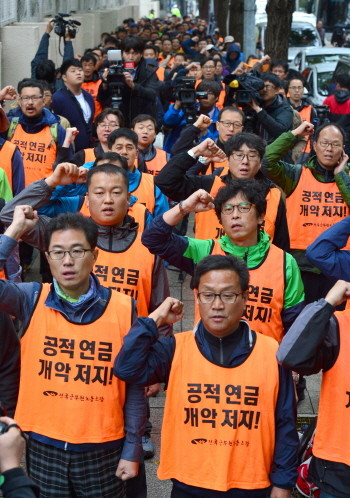 20일 오전 서울 종로구 정부서울청사 후문에서 열린 '공무원 연금 개악 저지 공무원노조 결의대회'에서' 전국공무원노동조합 회원들이 구호를 외치고 있다.