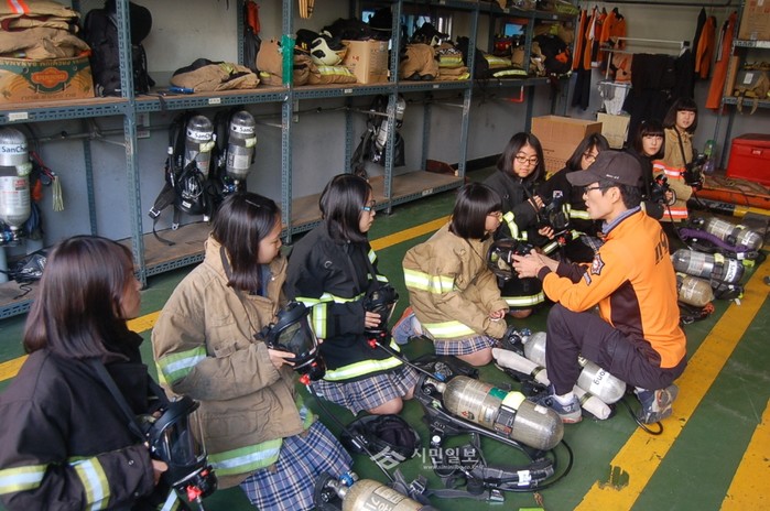 인천계양소방서는 지난 20일 계산여자중학교 2학년 학생 20여명을 대상으로 청소년들의 안전의식을 향상시키고자 소방공무원 직업체험 프로그램을 실시했다. 사진은 소방관의 지도 아래 공기호흡기와 방화복을 착용하고 설명을 듣고 있는 학생들의 모습. (사진제공=계양소방서)