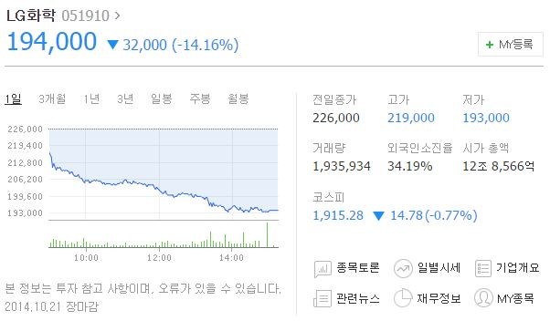 21일 유가증권시장에서 LG화학은 전일보다 3만2000원(14.16%) 줄어든 19만4000원을 기록했다.