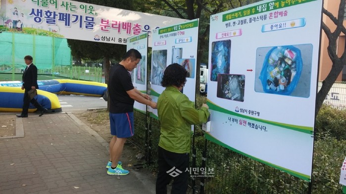 지난 20일 경기 성남시 중원구가 깨끗한 거리를 조성을 위해 개최한 `생활 쓰레기 분리배출 사진 전시회'에서 ‘쓰레기 분리 배출 나부터 실천’이라는 제목을 단 패널에 시민들이 약속을 의미하는 스티커를 붙이고 있다.(사진제공=성남시청)
