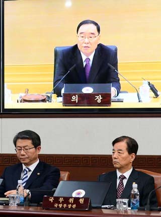 국무위원들이 21일 오전 서울 종로구 정부서울청사에서 열린 서울-세종 간 영상 국무회의에서 정홍원 국무총리의 모두발언을 듣고 있다.