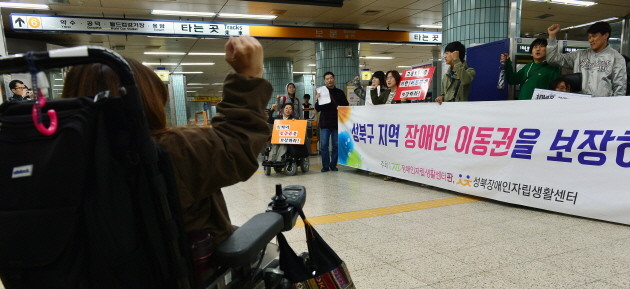 21일 오후 서울 성북구 지하철6호선 보문역에서 열린 ‘장애인 이동권 보장을 위한 기자회견’에서 장애인자립생활센터 관계자들이 장애인 등 교통약자 이동편의 증진을 위한 보문역 엘리베이터 설치를 촉구 하고 있다.