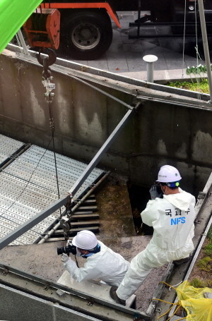 21일 오후 경기 판교 환풍구 추락사고 현장에서 경찰이 크레인을 동원해 철재 덮개를 지탱하던 지지대에 대한 하중실험을 한 뒤 사진을 촬영하고 있다.
