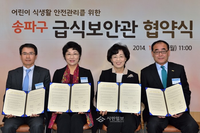 지난 20일 박춘희 송파구청장(오른쪽에서 두 번째)이 구청 3층 대회의실에서 어린이 식생활 안전관리를 위한 ‘송파 급식보안관 모바일 앱 업무협약(MOU)’ 협약식을 체결하고 건국유업, 가천대학교(왼쪽부터), 매일유업(맨 오른쪽) 관계자들과 기념촬영을 하고 있다.(사진제공=송파구청)