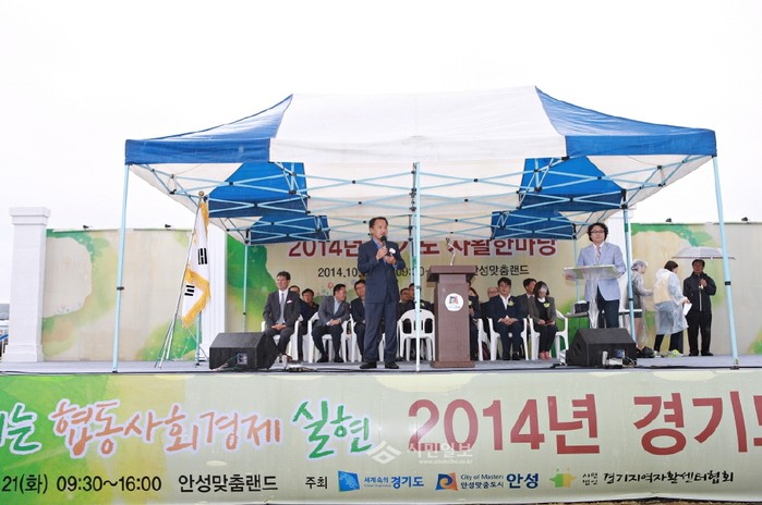 지난 21일 경기도와 안성시가 주최하고 (사)경기지역자활센터협회가 주관한 '2014년 경기도 자활한마당 행사'가 안성시 보개면에 위치한 안성맞춤랜드에서 열렸다. 사진은 이날 행사에 참가해 축사를 전하고 있는 황은성 안성시장의 모습. (사진제공=안성시청)