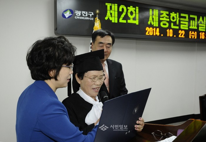 지난 22일 광진구 자원봉사센터가 노인들을 대상으로 운영하는 '제2기 세종한글교실'의 수료식이 수료생 33명·한글교실 봉사단 16명 등이 참석한 가운데 구청 종합상황실에서 개최됐다. 사진은 이날 수료식에 참석한 수료생 대표가 소감문을 낭독하는 모습. (사진제공=광진구청)