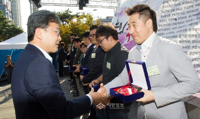 최근 김우영 은평구청장이 자율적인 나눔과 기부문화 확산을 위해 연신내 물빛공원에서 열린 '아름다운 이웃, 서울디딤돌 나눔의 축제'에서 평소 '아름다운 이웃, 서울디딤돌' 사업에 적극 참여해 이웃에게 나눔을 실천한 기부업체 대표들에게 감사패를 전달하고 있다.(사진제공=은평구청)