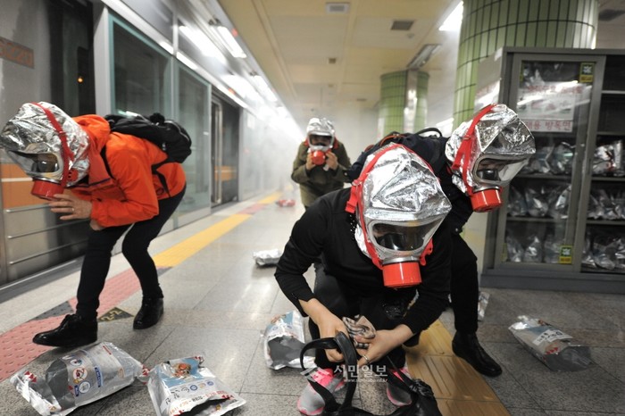 지난 22일 오후 서울 중랑구는 지하철 6호선 봉화산역에서 재난 대응 '안전한국훈련'을 실시했다. 사진은 훈련의 일환으로 지하철역 화재 발생시 승객대피 훈련을 하고 있는 모습. (사진제공=중랑구청)