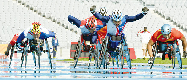 23일 오전 인천 서구 연희동 인천아시아드주경기장에서 열린 2014 인천 장애인 아시안게임 육상 남자 800m T54 결승에 참가한 대한민국 홍석만을 비롯한 선수들이 결승선을 통과 하고 있다.