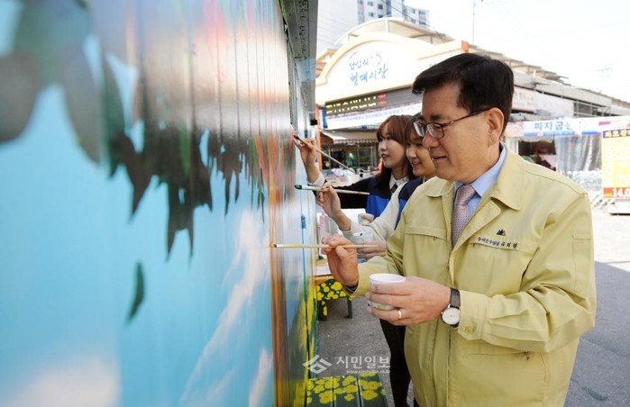 서울 동대문구는 최근 답십리현대시장 일대에서 꽃·나무 등 '벽화그리기 및 녹화사업'을 실시했다. 사진은 유덕열 동대문구청장이 답십리현대시장을 방문해 벽화를 그리고 있는 모습. (사진제공=동대문구청)