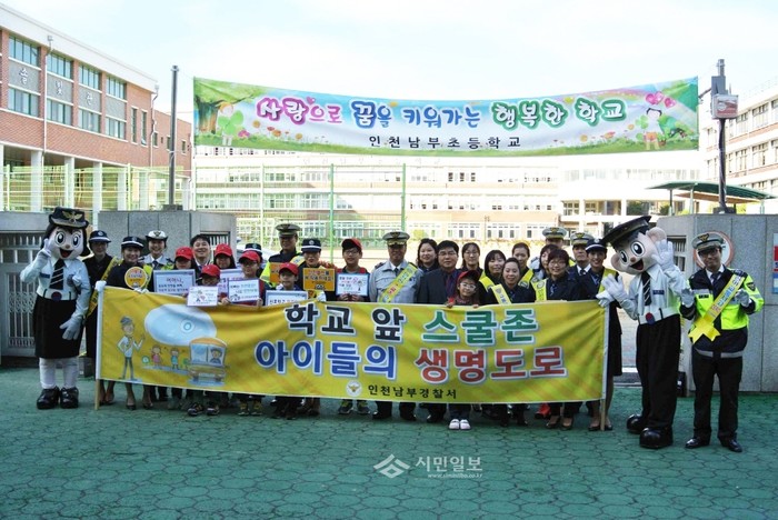 인천남부경찰서는 최근 주안동 남부초등학교 앞 어린이보호구역에서 안전한 스쿨존 정착을 위한 ‘녹색어머니·경찰관 합동 캠페인’을 실시했다. 사진은 녹색어머니회·경찰관계자 외 남부초교 학생들이 스쿨존 홍보캠페인 활동 후 기념촬영하는 모습. (사진제공=인천남부경찰서)