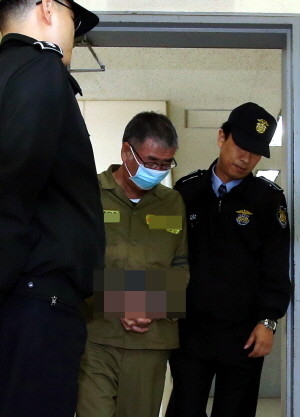 27일 오전 광주 동구 광주지방법원에서 세월호 선박직 승무원(15명)에 대한 결심 공판이 열리기 앞서 이준석 선장이 광주지검 구치감에 도착하고 있다.