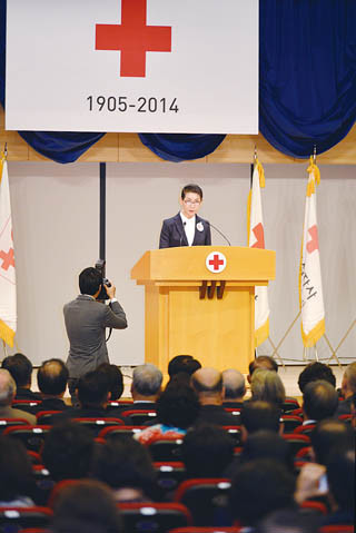 김성주 대한적십자사 총재가 27일 오전 서울 중구 소공로 우리은행 본점 대강당에서 열린 대한적십자사 창립 109주년 기념식에서 기념사를 하고 있다.