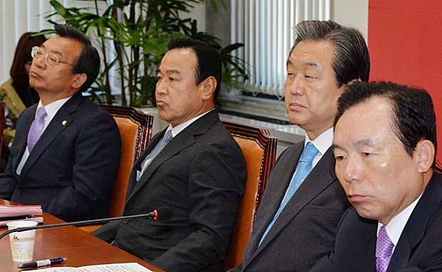 27일 오전 서울 여의도 국회 새누리당 대표실에서 열린 최고위원회의에서 김무성 대표 등 지도부가 당직자보고를 경청하고 있다.