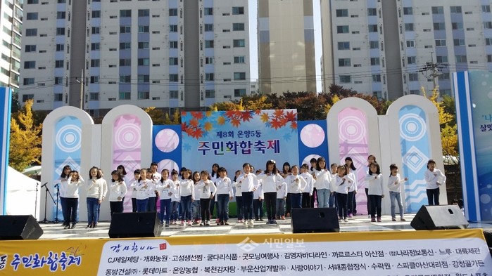 최근 충남 아산시 온양5동 주민자치위원회가 지역내 기관·단체·주민 등 1500여명이 참여한 '제8회 온양5동 주민화합축제'를 온양 용화초등학교에서 개최했다. 이날 축제는 주민 누구나 참여할 수 있는 노래자랑, 수지침, 가훈써주기, 페이스페인팅 등으로 구성됐다. 사진은 노래자랑에 참여한 지역내 어린이들의 모습. (사진제공=아산시청)