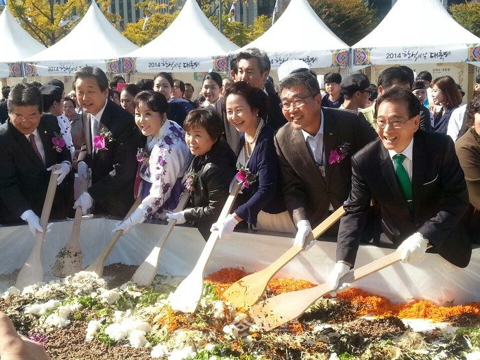 원경희 경기 여주시장(오른쪽에서 두번째)이 28일 오전 광화문 광장 일대에서 열린 '제2회 한식의 날 대축제' 행사장을 찾아 대형 용기에 4347인분의 비빔밥을 비비는 '평화통일 염원 팔도식자재 퍼포먼스'에 참가했다. 사진은 원 시장이 내빈들과 함께 기념촬영한 모습. (사진제공=여주시청)