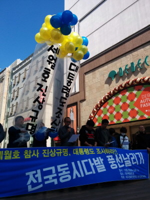 28일 오후 대구 중구 동성로 야외무대 앞 광장에서 진보성향의 대구지역 시민단체가 세월호 참사 200일을 앞두고 진상규명과 책임자 처벌 등을 촉구하며 대형 풍선을 날리고 있다.