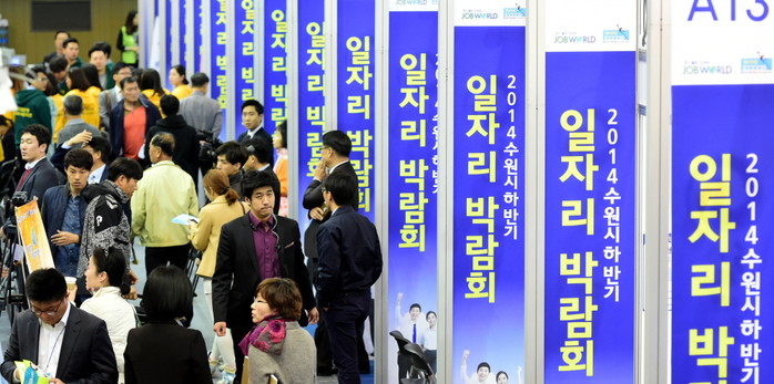 28일 오전 경기 수원실내체육관에서 열린 수원시 일자리 박람회에서 구직자들이 자신들에게 맞는 일자리를 찾고 있다.