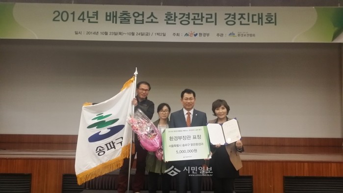 서울 송파구가 최근 실시된 환경부 주관 '2013년 시·도별 오염물질 배출업소 환경관리 평가'에서 우수기관으로 선정돼 환경부장관 기관표창을 받고 기념촬영을 하고 있다.(사진제공=송파구청)