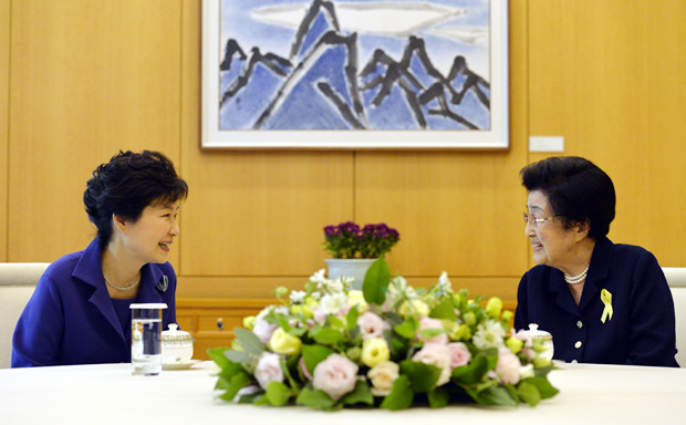 박근혜 대통령이 28일 오후 청와대에서 고(故) 김대중 전 대통령의 부인 이희호 여사를 접견하고 있다.