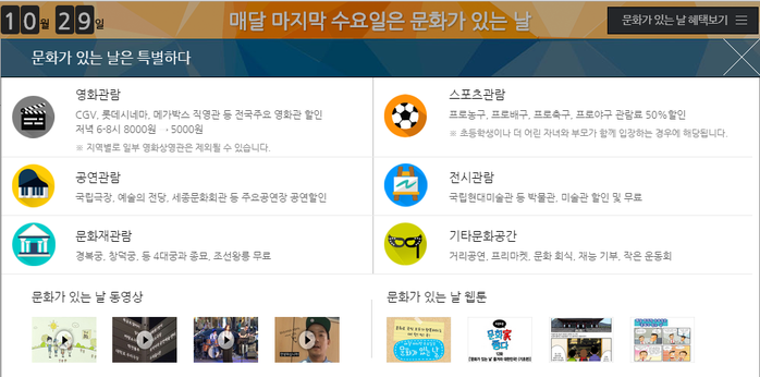 지난 1월부터 시행하고 있는 '문화가 있는 날'은 매월 마지막주 수요일로 전국 고궁 무료개방은 물론, 각종 문화공연도 저렴한 가격으로 볼 수 있도록 각종 문화관련 헤택이 주어진다.