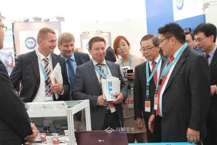 | ▲ '2014 폭스바겐 국제 자동차 부품박람회(IZB)'에 참가한 구미시 기업 부스에 참가자들이 방문한 모습. (사진제공=구미시청) | ||