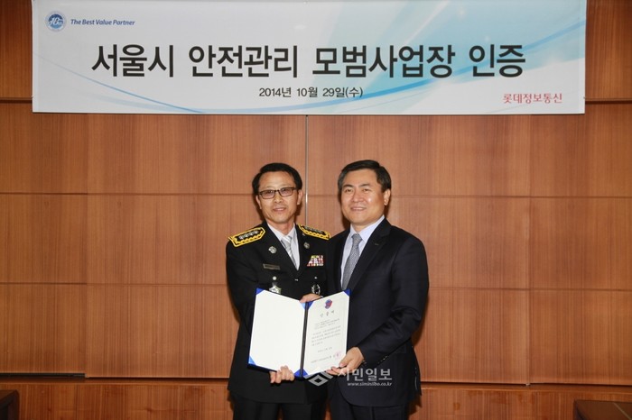 서울 구로소방서는 29일 자율안전 관리체계 정착과 안전 환경 조성을 위해 서울시 소방재난본부가 추진한 '2014년도 안전관리 모범사업장 평가'에서 안전관리모범사업장으로 선정된 ‘롯데정보통신㈜’에 인증서를 전달하고 '현판 부착식 행사'를 개최했다. 사진은 이날 행사에 참석한 김송연 구로소방서장(왼쪽)과 마용득 롯데정보통신 대표이사(오른쪽)의 모습. (사진제공=구로소방서)