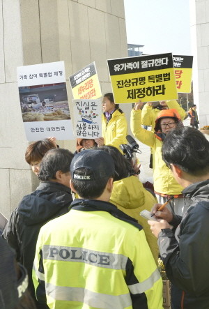 박근혜 대통령의 국회 시정연설을 앞둔 29일 오전 서울 여의도 국회 본청 앞에서 세월호가족대책위가 피켓을 들고 있다.