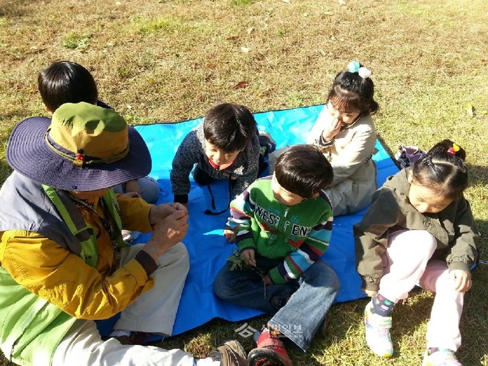 경기 성곡초등학교병설유치원은 지난 28일 여월산에서 부천시니어클럽 '푸르메'와 함께 자연물 찾아오기, 잎맥 관찰하기, 자연의 소리 듣기, 솔방울로 놀이하기, 나무가 어떻게 자라고 열매 맺는지 등의 다채로운 숲 체험활동을 실시했다. 사진은 이날 체험에 참가한 아이들의 모습. (사진제공=부천교육지원청)